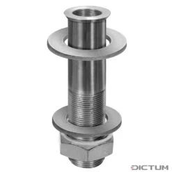 Douille métallique pour réduire les trous des volets d’établi de 25 ou 30 mm à 16 mm. Le diamètre intérieur est adapté à la tige du système de serrage Piher TCP N° 730095 , ce qui permet de l’utiliser sur les bancs de sculpture et d’établi. Les douilles sont introduites par le haut dans les trous des valets et bloquées par le bas avec un écrou à vis. Si la douille doit rester de manière permanente sur l’établi, le col chanfreiné peut être encastré dans le panneau. Pour les forces élevées et pour éviter un gauchissement à l’intérieur du perçage du panneau, le disque de pression fourni permet de répartir les forces et de ménager les trous des valets.