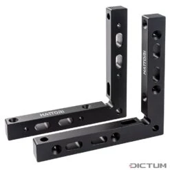 - Vissée par des vis à bois sur un panneau de bois (plateau d’établi) ou directement sur une pièce, l’équerre peut être utilisée partout. Lorsqu’elle est fixée verticalement, il est possible de monter de manière simple et rapide par exemple, des butées auxiliaires ou des dispositifs avec un angle précis de 90°.