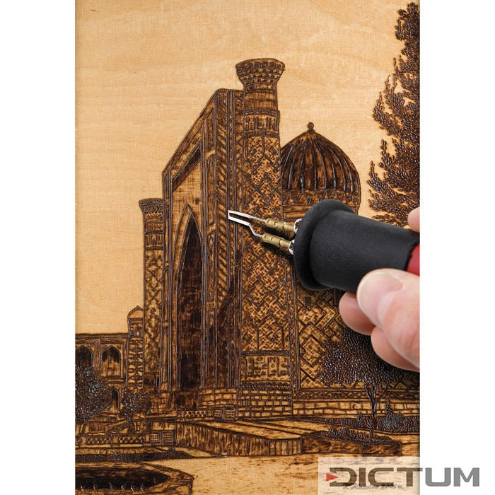Ce pyrograveur de Burnmaster convient également aux stations et gouges d’autres fabricants. La section transversale ergonomique de poignée permet, une position de travail auto-alignée. Adaptateur pour stations de pyrograveur d’autres fabricants inclus, sans gouge. Convient pour N° 715303.