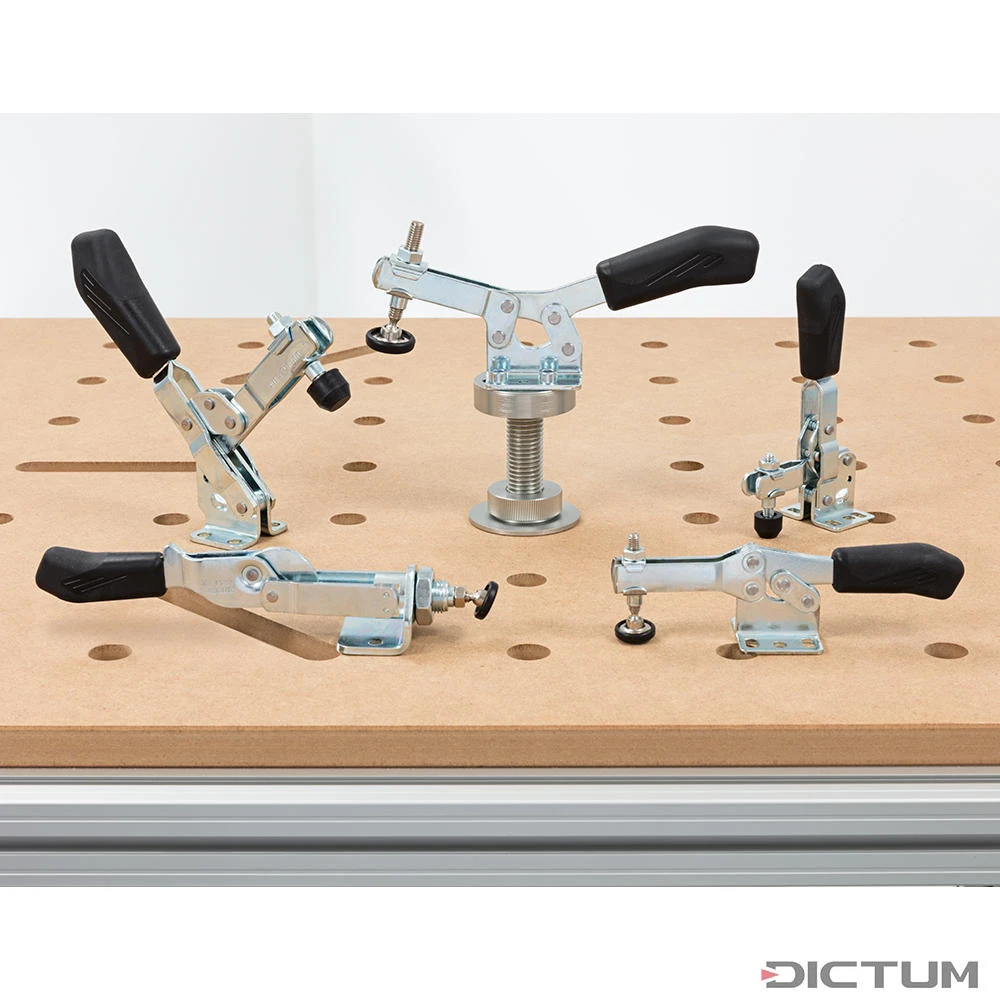 Rivets en acier inoxydable coulissant dans des coussinets durcis. Poignée ergonomique, résistante aux huiles avec repose-main de grandes dimensions. Dispositif de verrouillage de la vis de pression à l’extrémité du bras de serrage. Entièrement galvanisé. Incl. une vis de pression avec élément de pression vulcanisé en néoprène résistant aux huiles pour protéger les pièces fragiles et une plaque de pression équipée d’un clapet de protection.